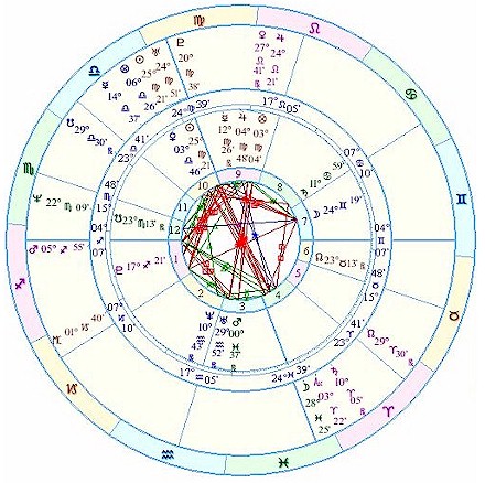 The following is the Solar Return chart for the year in question, with the natal chart in the outer ring so that we can easily see which natal planets are brought to the fore in the SR chart: