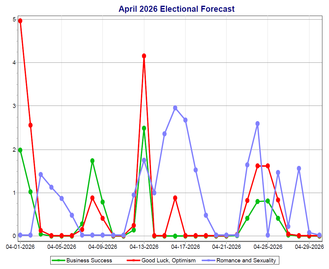 The higher the value, the more transits that favor the different categories that are happening on a given date. So, for example, in the February 2026 graph above, the highest score for Romance & Sexuality (blue line) is on the 8th, for Good Luck & Optimism (red line) is on the 22nd, and for Business Success (green line), it’s on the 22nd.