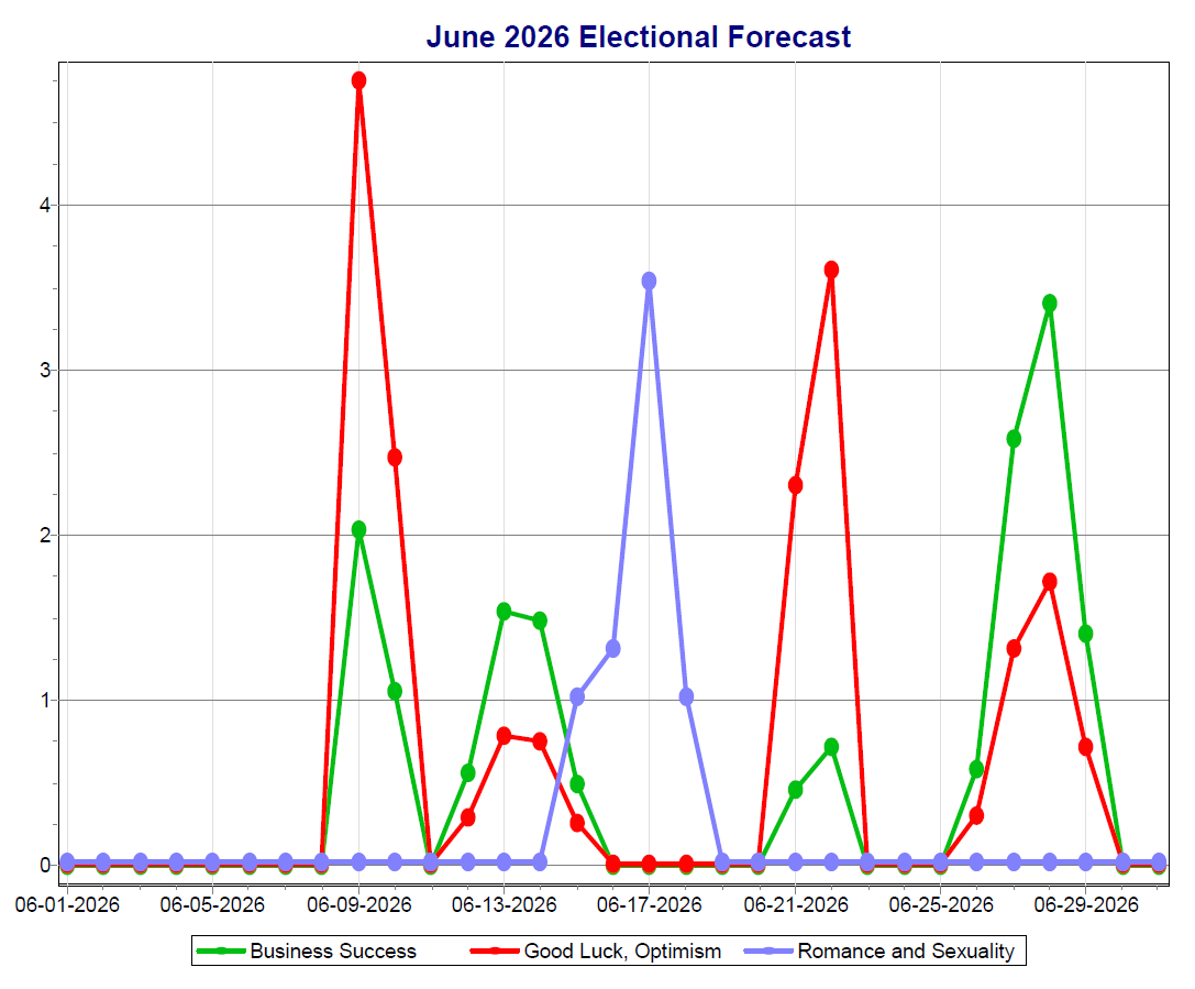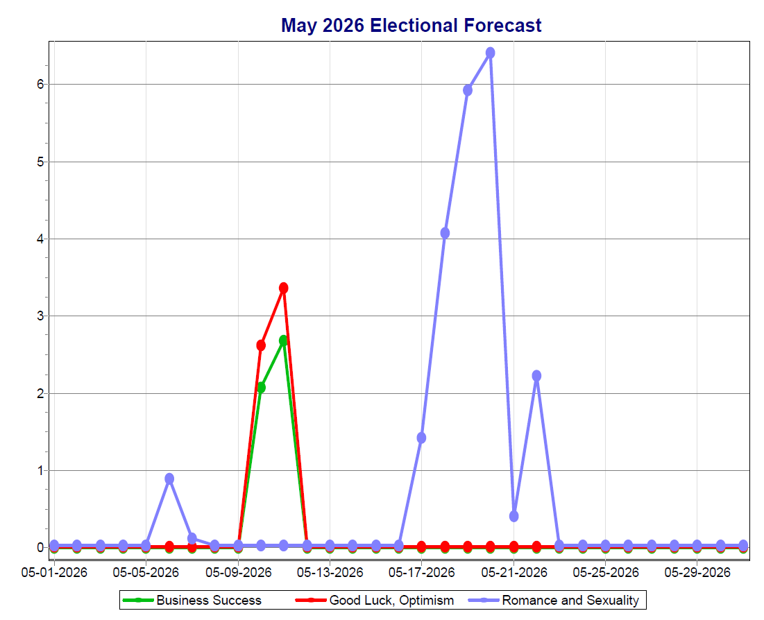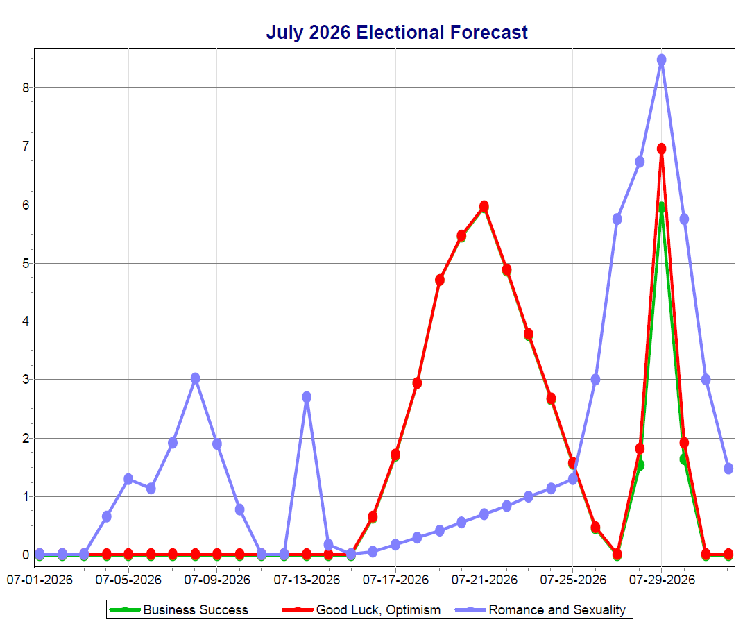 The higher the value, the more transits that favor the different categories that are happening on a given date. So, for example, in the April 2026 graph above, the highest score for Romance & Sexuality (blue line) is on the 16th, for Good Luck & Optimism (red line) is on the 1st, and for Business Success (green line), it’s on the 13th.