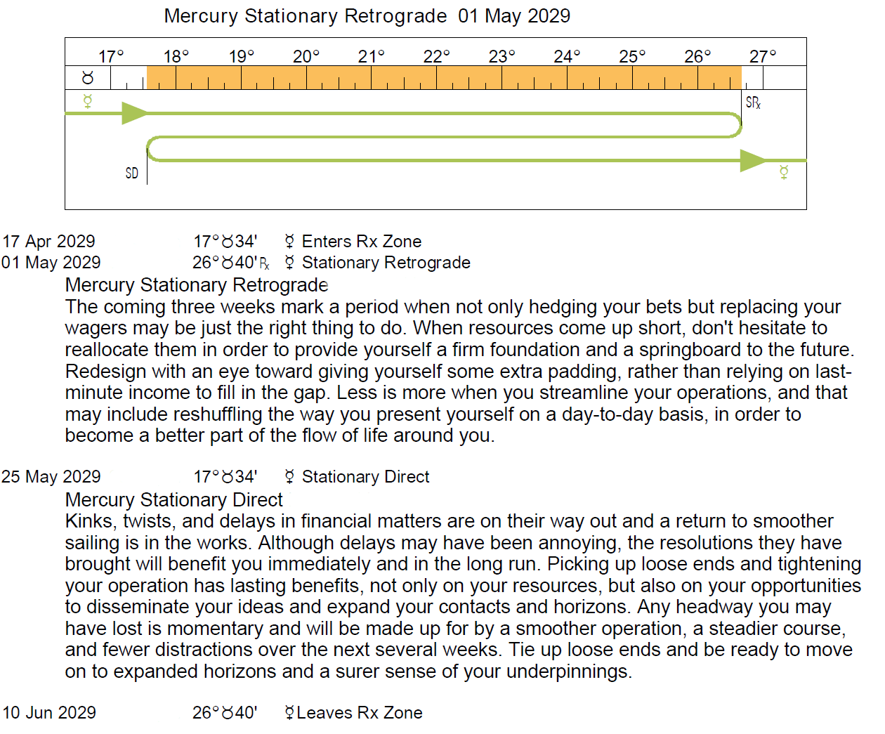 - On April 17, 2029, Mercury enters the Retrograde Zone (pre-retrograde shadow) at 17° Taurus 34′