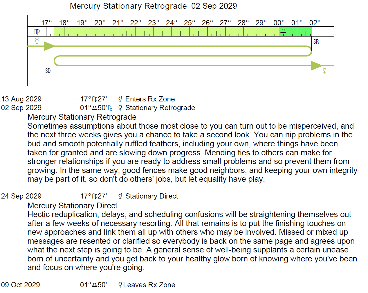 - On September 2, 2029, Mercury stations and turns retrograde at 1° Libra 50’Rx