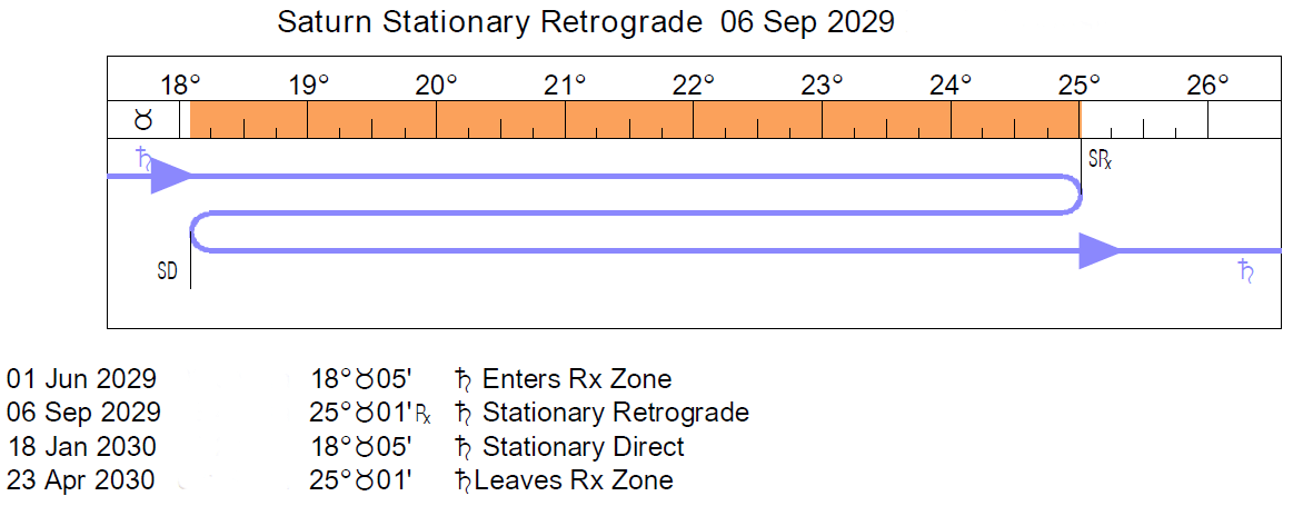 - Saturn enters retrograde zone/shadow on June 1, 2029, at 18° Taurus 05′