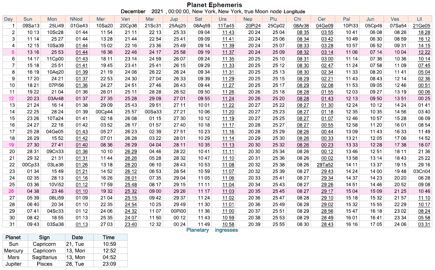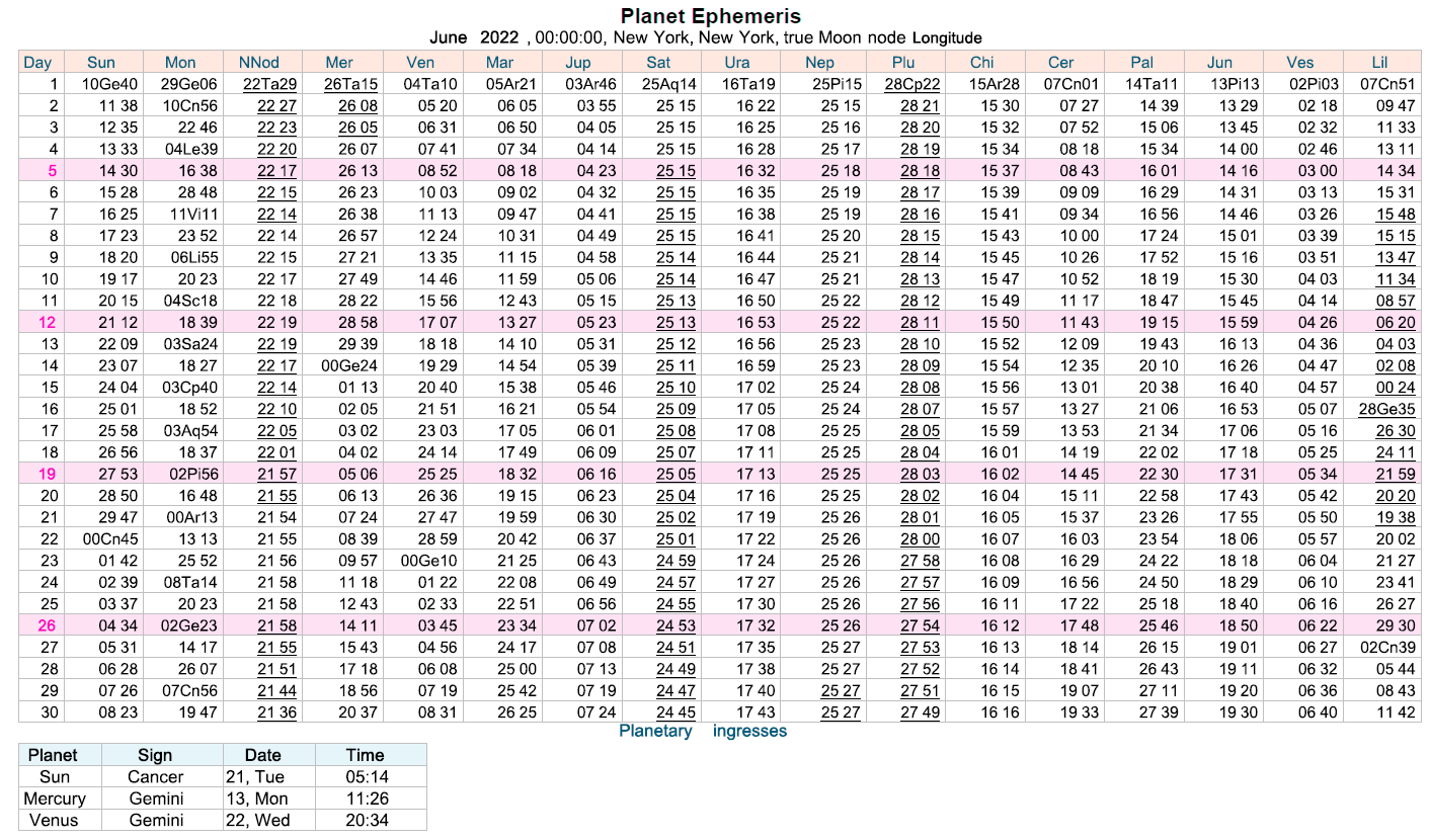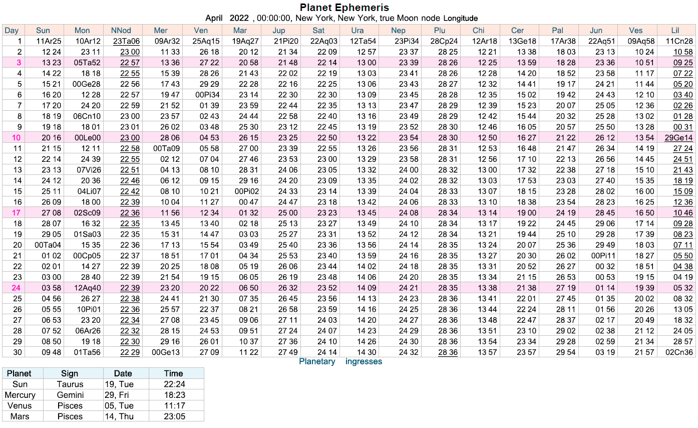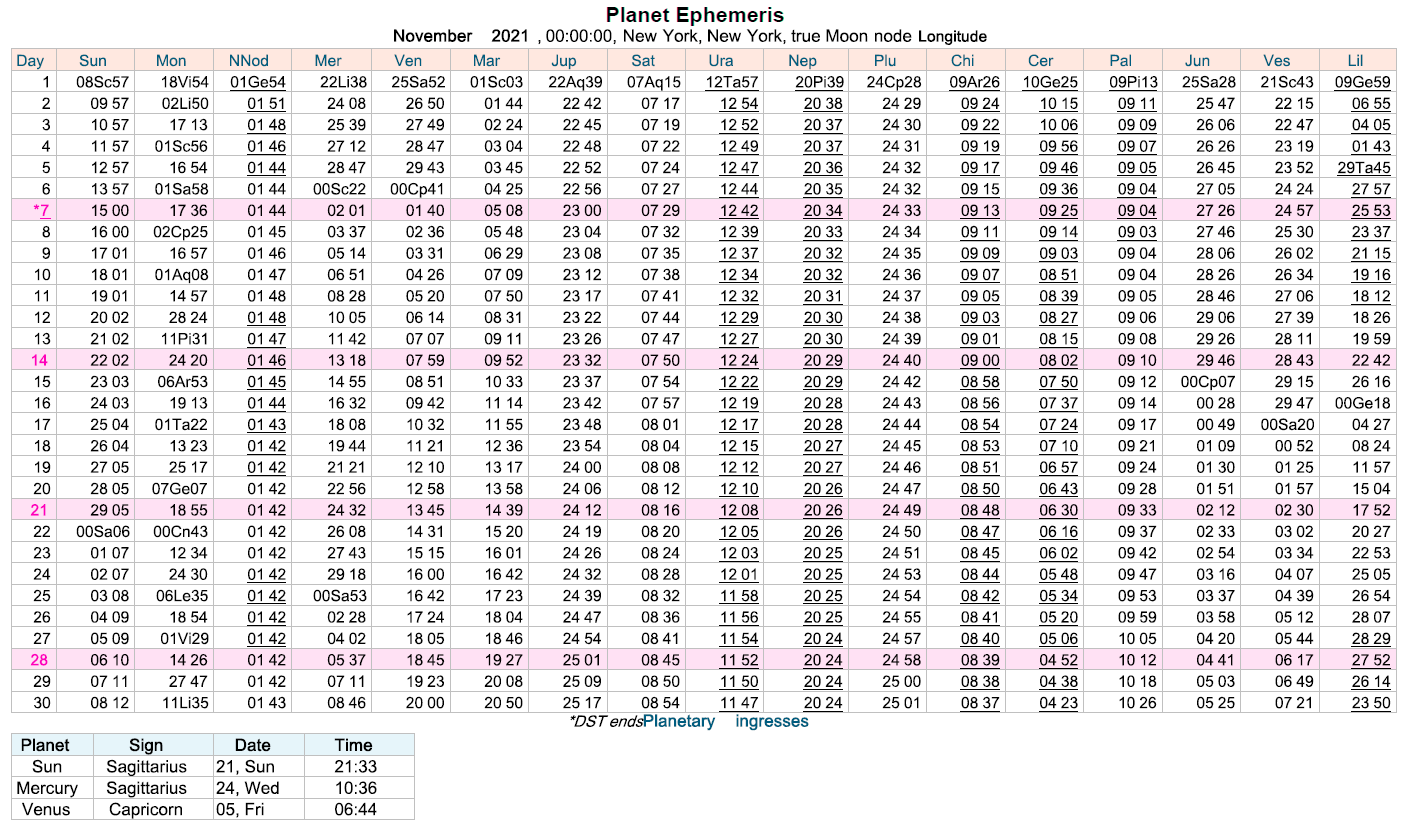 Ephemerides with additional points are for Eastern Time. The North Node and Lilith are the True positions. Retrogrades are underlined. Extra points are Chiron, Ceres, Pallas, Juno, Vesta, and Lilith. These come from the excellent software, Sirius 3.0.