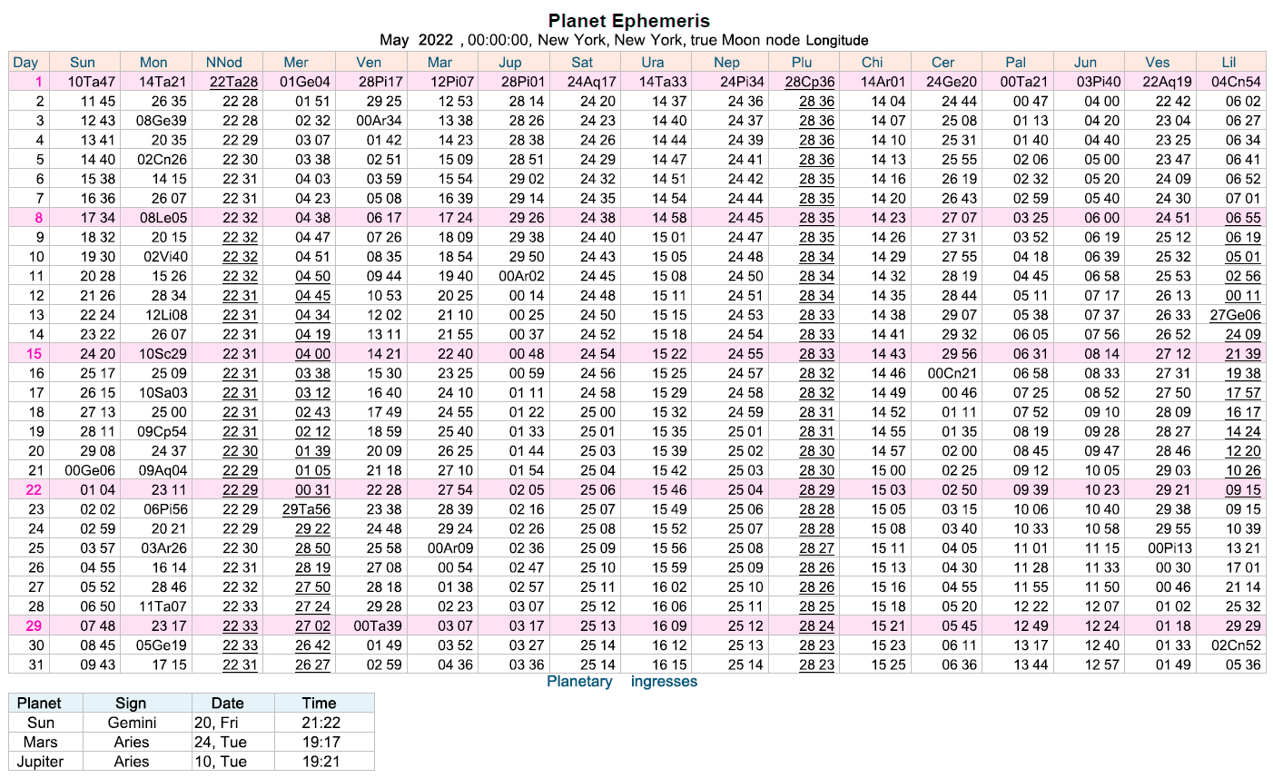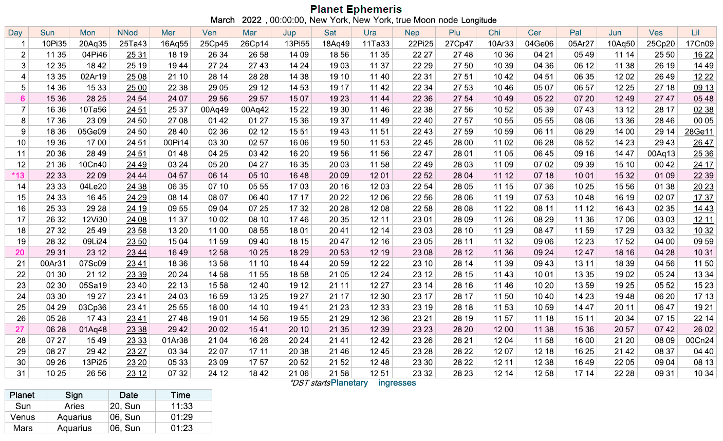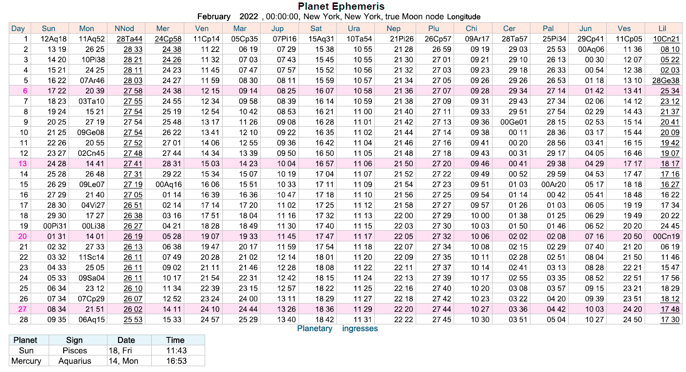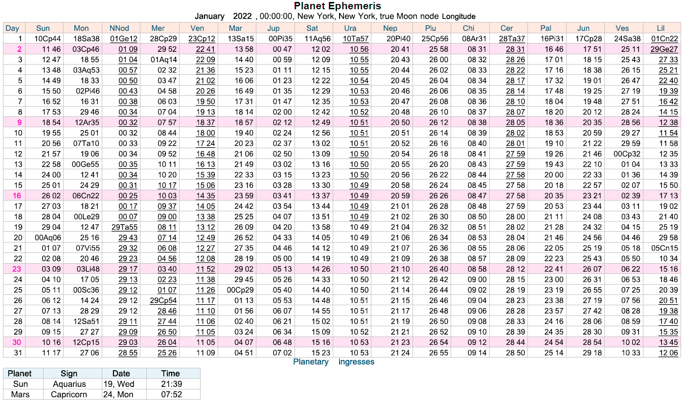 Ephemerides with additional points are for Eastern Time. The North Node and Lilith are the True positions. Retrogrades are underlined. Extra points are Chiron, Ceres, Pallas, Juno, Vesta, and Lilith. These come from the excellent software, Sirius 3.0.