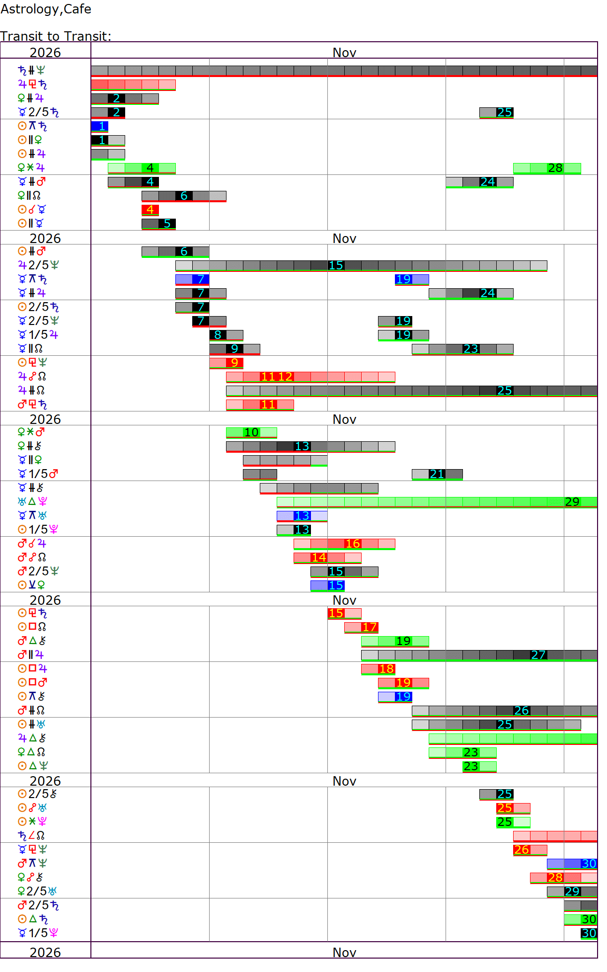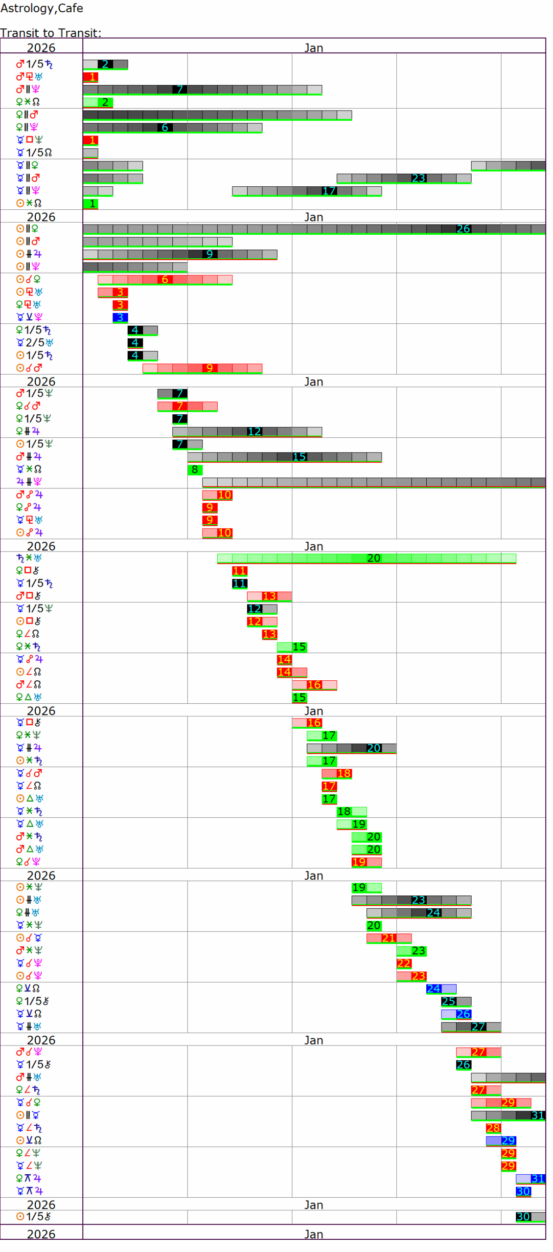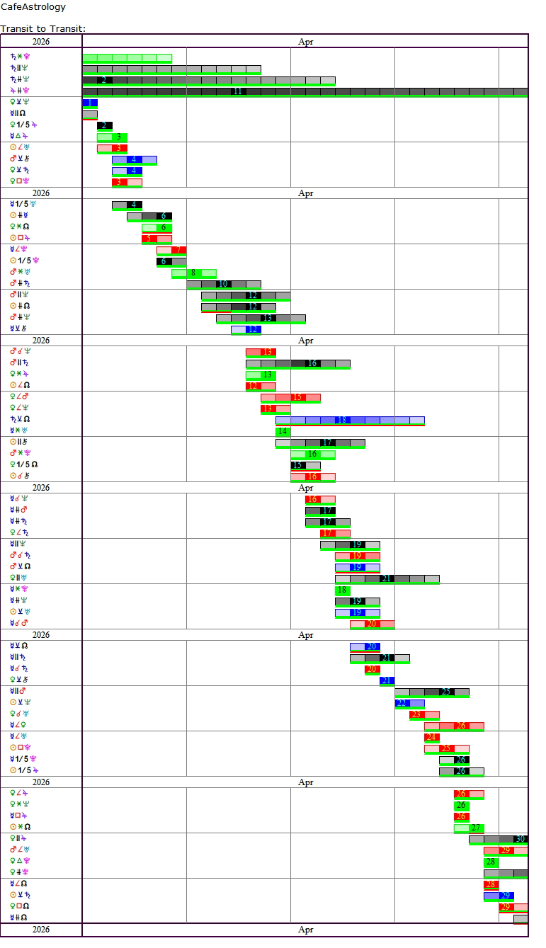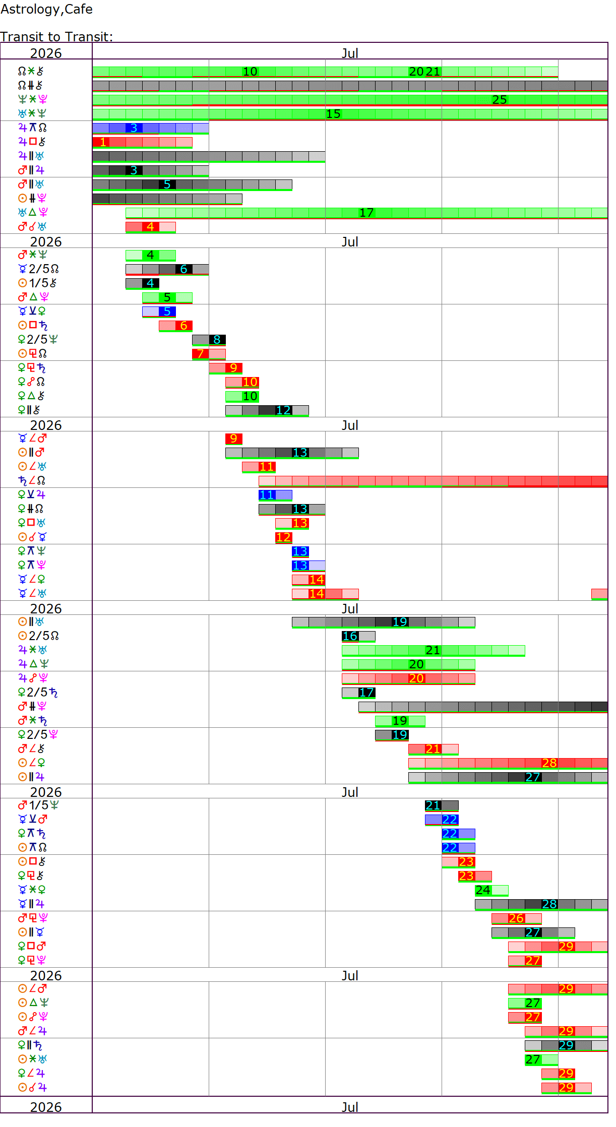 What do the transits mean? See Transit to Transit Planetary Aspects for interpretations of each planet in aspect to one another.