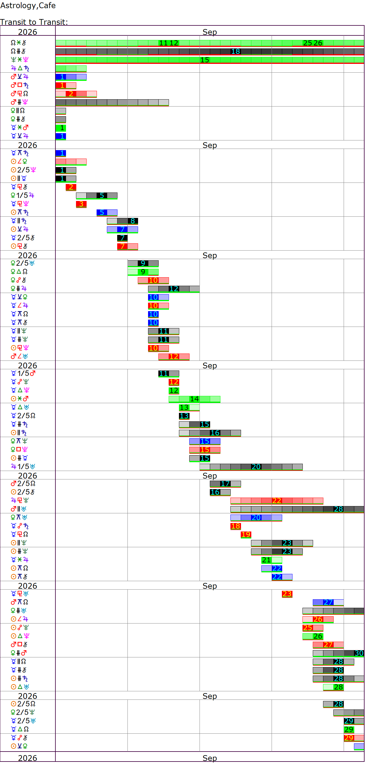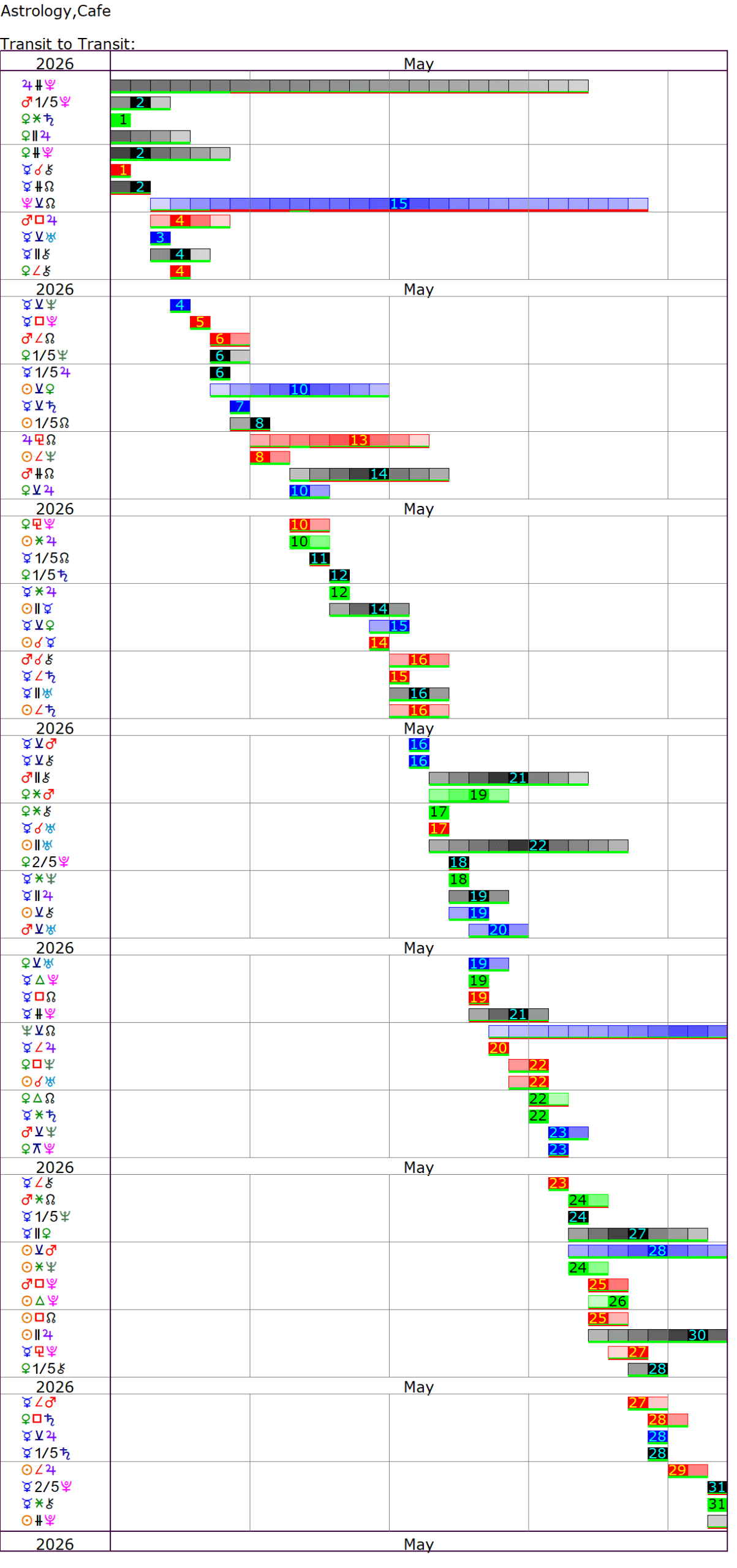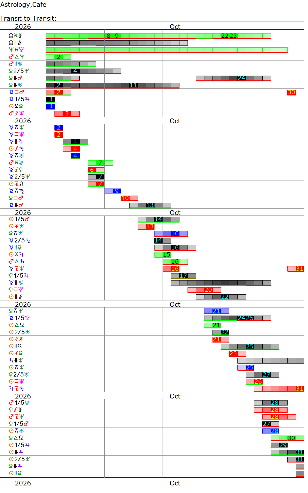 What do the transits mean? See Transit to Transit Planetary Aspects for interpretations of each planet in aspect to one another.